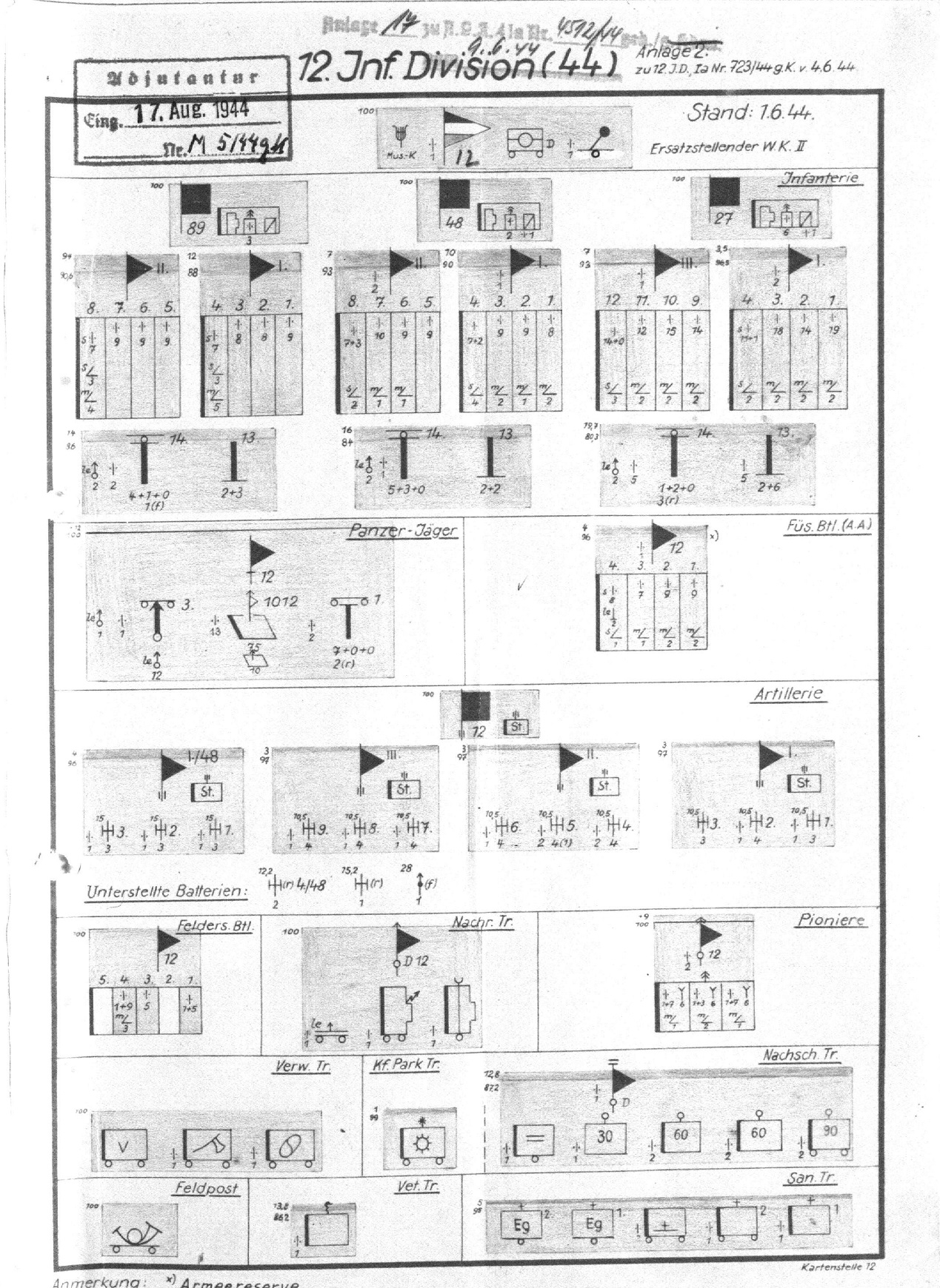 | Stand 10.10.1944 - 6./Art.Rgt.12 bei IV./Art.Rgt.1553, 5./Art.Rgt.12 bei III./Art.Rgt.6 unter 553.VGD; | ||||||||||||||||||||||||||||||||||||||||||||||||||||||||||||||||||||||||||||||||||||||||||||||
