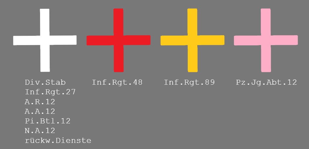 | 12.Infanterie-Division Div.St.Qu., den 7.Juli 1940 Abt. 1a Betr: Truppenkennzeichen Zur Kenntlichmachung der Truppenteile der Div. wird mit sofortiger Wirkung folgendes angeordnet: 1.) I.R. 48 und I.R. 89 tragen künftig an einer Schulterklappe (Schulterstück) einen 1,5 cm breiten Streifen ähnlich dem Unterführerabzeichen. I.R. 48 in roter, I.R. 89 in gelber Farbe. Beschaffung regelt IVa der Division. 2.) Die Fahrzeuge und Kraftfahrzeuge sämtlicher Truppenteile der Div. haben sofort an der rechten unteren Ecke ihres Truppenkennzeichens ein Kreuz in folgenden Farben anzubringen: Div.Kdo. = weiß I.R. 27 = weiß I.R. 48 = rot I.R. 89 = gelb A.A. 12 = weiß A.R. 12 = weiß Pz.Jäg.Abt. 12 = rosa Pi. 12 = weiß N. 12 = weiß Rückw. Dienste = weiß Größe: Balkenlänge je 5 cm, Balkenbreite je 1 cm. 3.) Der Truppe ist im Unterricht klar zu machen, daß nunmehr im Rahmen der Div. wieder jeder Soldat, jedes Fahrzeug und jedes Kfz. hinsichtlich seiner Truppenzugehörigkeit gekennzeichnet ist. 4.) Der Vollzug der vorstehenden Anordnung ist zu melden. |