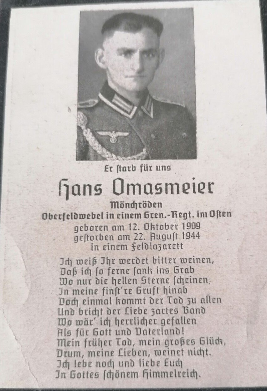 | Omasmeier Johann | 22.8.44 gefallen Radom (Ofw.); | geb.12.10.09 | ||