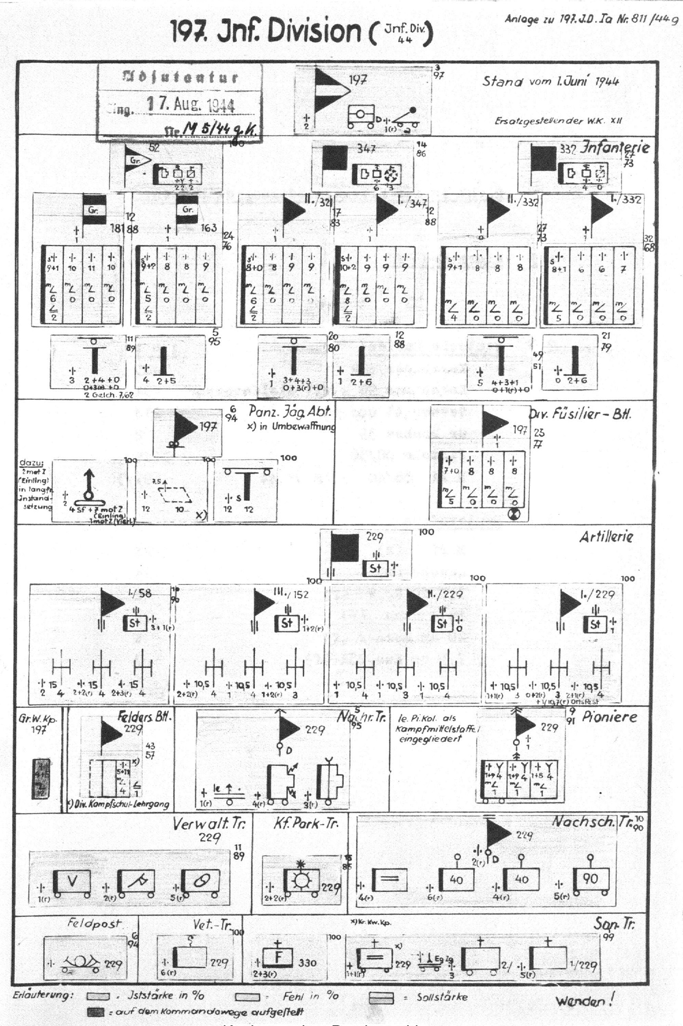 ![]() Nicht in der Kriegsgliederung enthalten: 1.) Alarm-Kp."F" 11 le.M.G. 2.) Deutsche Waffen: Ist: Karabiner 98k 7485 Karabiner 98k mit Zielfernrohr 94 Gewehr 41 und 43 213 Gr.Büchse 39 2 Pistole 08/38 1269 M.Pi.38/40 / M.Pi.44 697/30 3.) Beutwaffen: M.Pi.(r) 25 Gewehr (r) 26 5,2cm Gr.W.(r) 2 Pz.Büchse (r) 3 28cm Mörser (f) 4 7,5cm Kan.231(f) 7 Anlage zu 197.I.D., Ia Nr.811/44 geh.v.4.6.44. Erläuterungen der Sollstärken: Einheit Offz. Uffz. Mannschaften Hilfsw. ------------------------------------------------------------------------- Stab Pz.Jg.Abt.mit Stabs-Kp. 6 20 51 4 Sturmgeschütz-Abteilung 3 44 74 5 Fla-Kompanie(gek.) 2 34 108 11 Tr.Entgiftungszug einer San.Kp. - 9 25 17 |