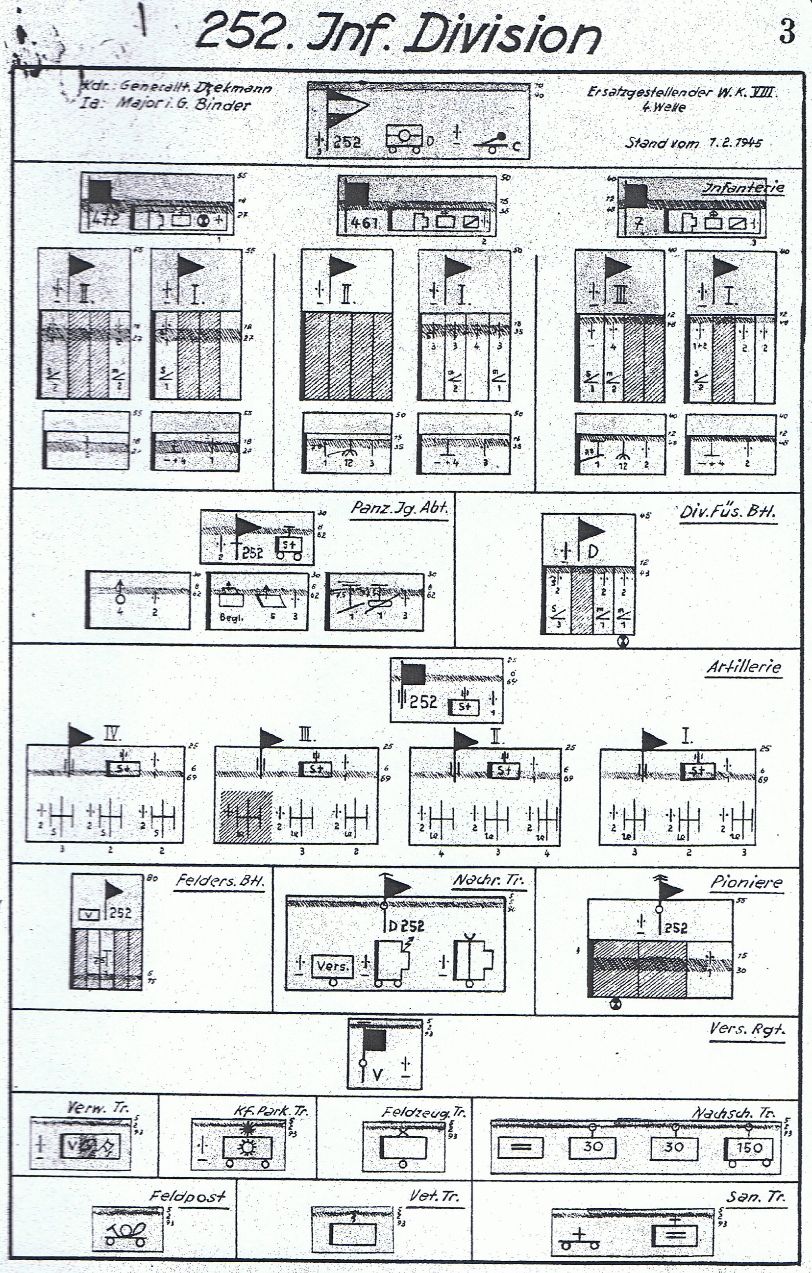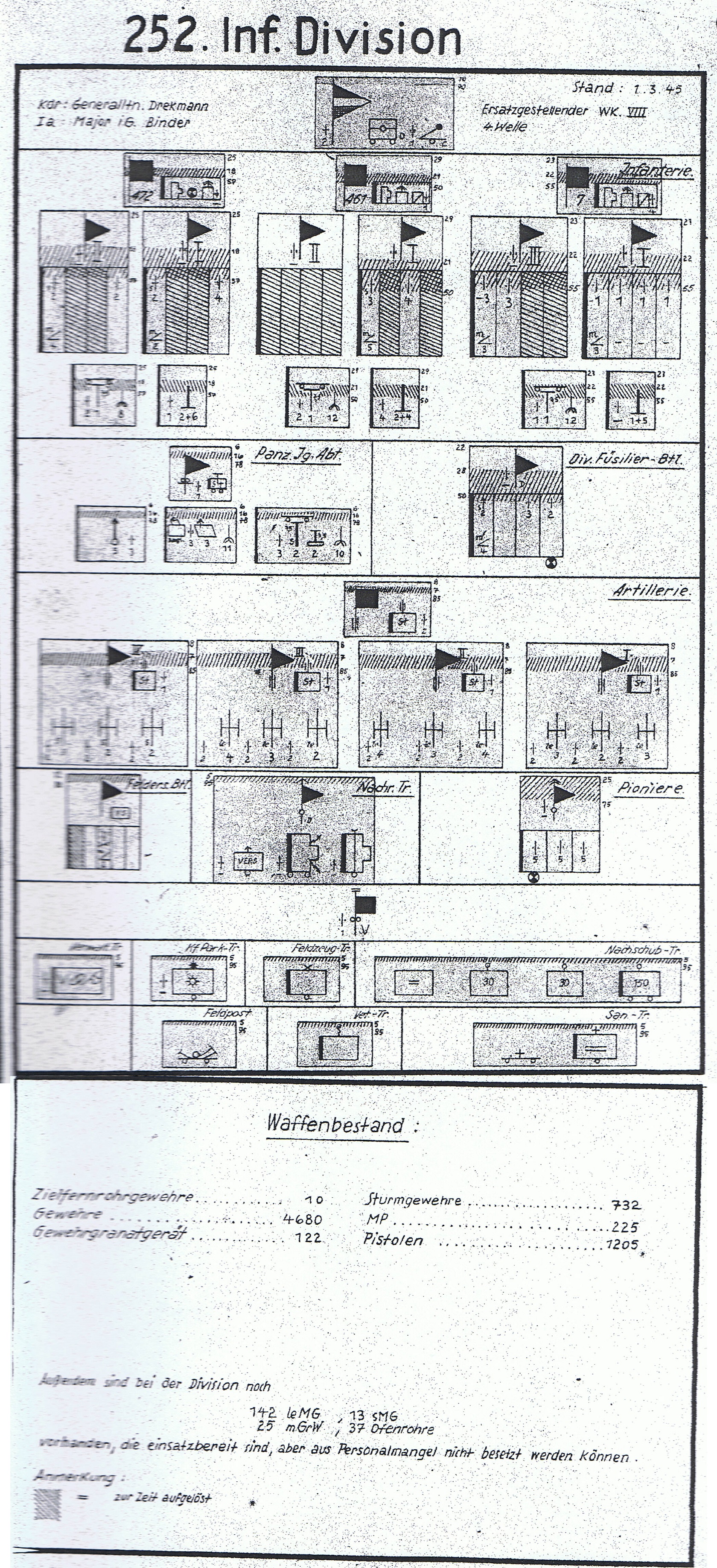 | Oberkommando des Heeres Gen.St.d.H. Op.Abt.(III) H.Qu., den 8.12.1939 Nr.4672/39 geh. An H.Gr.A, B, C. Aus den in a.) angegebenen Div.4.Welle scheiden die s.F.H.mot. als Div.Artl. aus und werden Heeresartillerie. Sie werden kriegsgliederungsgemäß durch die in b.) genannten schw.F.H.Abt.besp., die bisher Heeresartillerie waren, ersetzt. a.) Es gibt ab: die 258.I.D. (A.O.K.1) die IV./258 an die 1.Armee die 252.I.D. (A.O.K.1) die IV./252 an die 1.Armee die 251.I.D. (A.O.K.4) die IV./251 an die 16.Armee die 267.I.D. (A.O.K.4) die IV./267 an die 16.Armee b.) Es erhält: die 258.I.D. (A.O.K.1) die IV./209 von der 1.Armee die 252.I.D. (A.O.K.1) die IV./223 von der 1.Armee die 251.I.D. (A.O.K.4) die IV./239 von der 16.Armee die 267.I.D. (A.O.K.4) die IV./231 von der 16.Armee Der Austausch hat sofort zu erfolgen. Die zu treffenden Maßnahmen regeln die H.Gr. untereinander. |