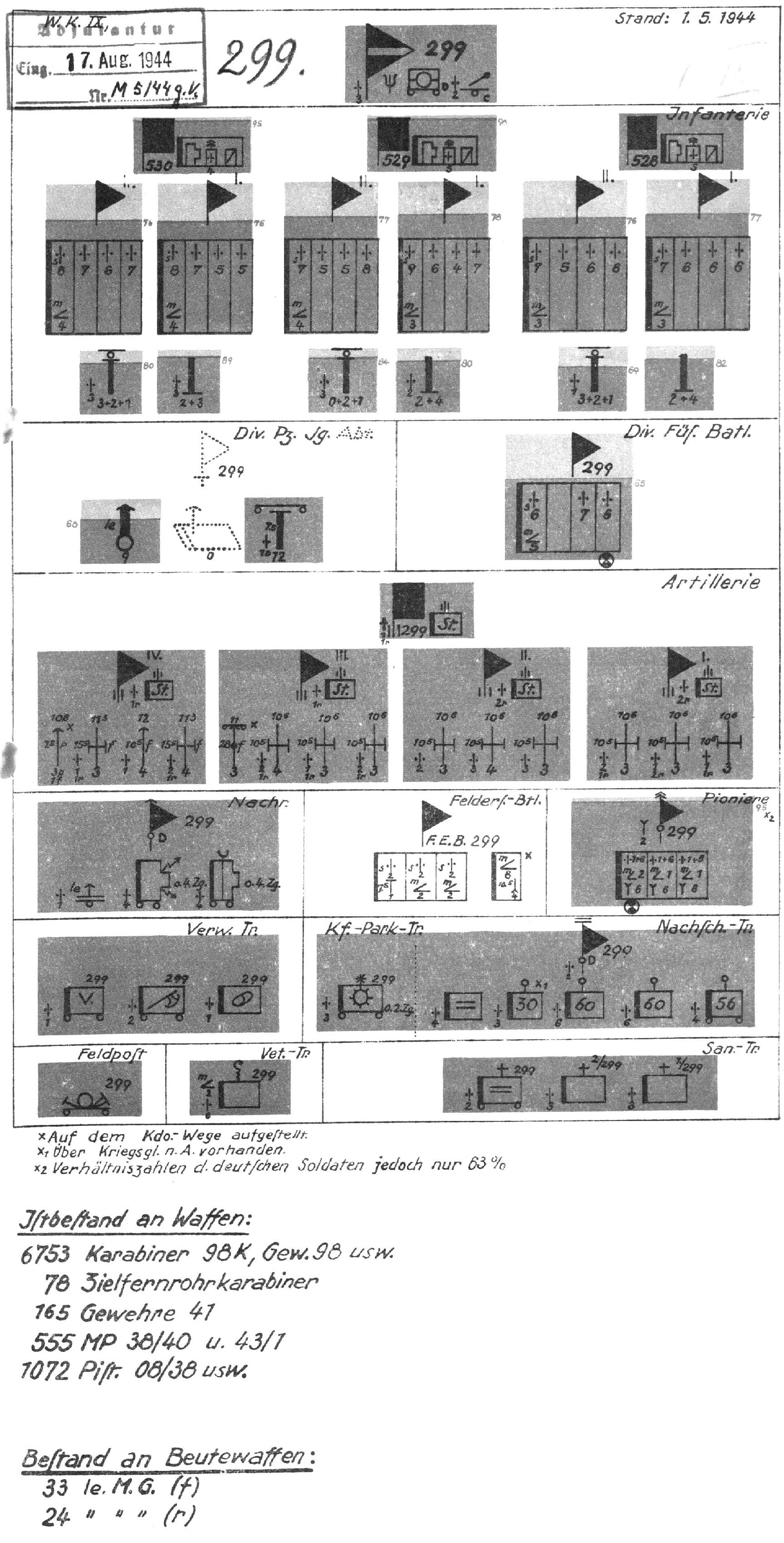 Heresgruppe A Bei Abtransport der 299.I.D. nach dem Osten ist das Pi.Btl.299 bei der 1.Geb.Div. zu belassen. |
