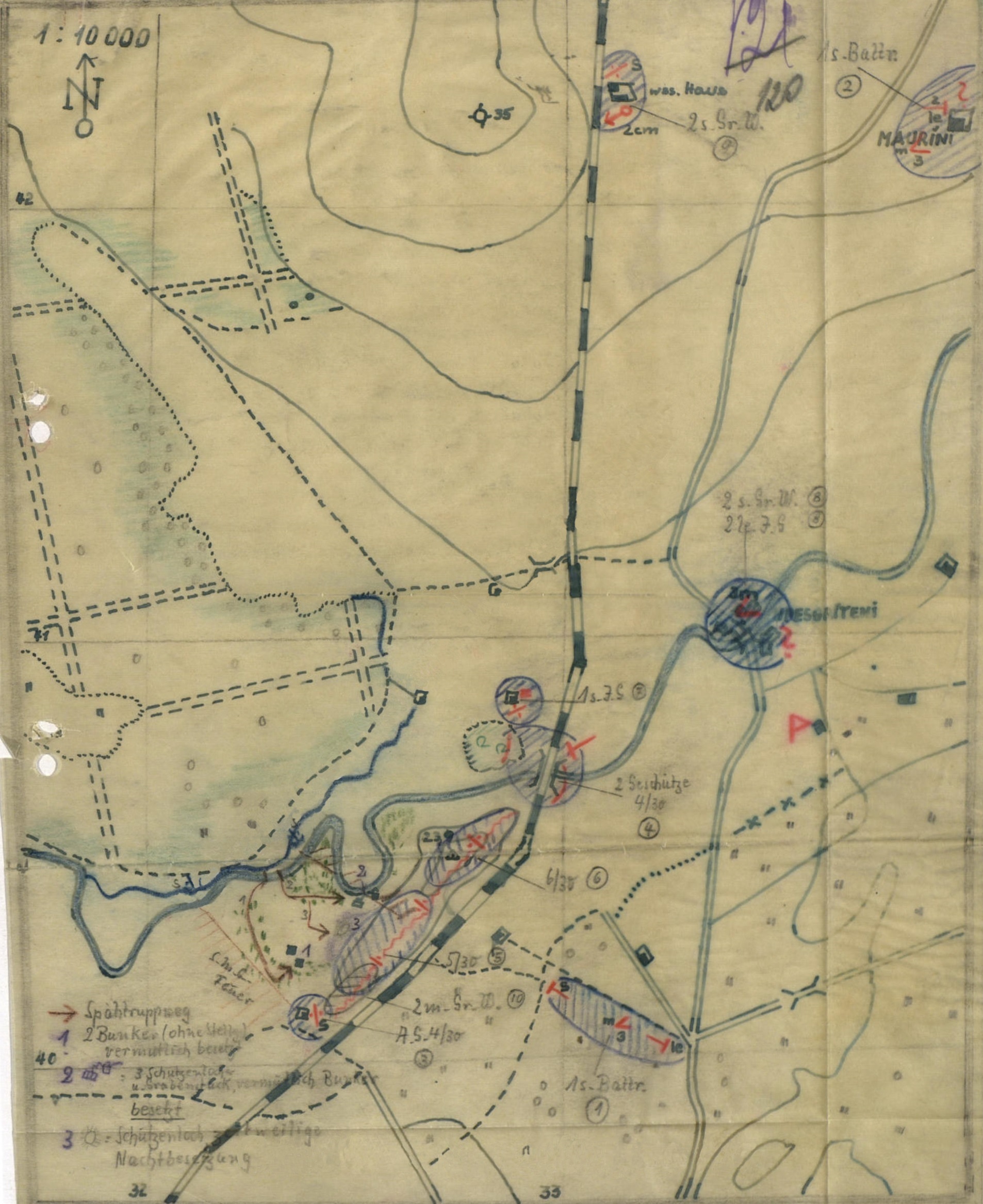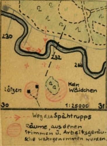 Btl.Gef.Std., den 23.12.44 Abtlg.Ia Meldung über das Ergebnis des am 22.12. gelaufenen Spähtrupps der 1./G.R.6 Auftrag: Erkundung der Übersetzmöglichkeiten in der Bachschleife im Meldebandabschnitt 231. Ausmachen des genauen Ortes der M.G.Stände vorwärts der Bachschleife; Feststellen ob Bunker und durchlaufendes Grabensystem dort. Ergebnis: Übersetzmöglichkeiten wurden nicht gefunden; Der genaue Ort von 3 M.G.Ständen konnte ausgemacht werden. Aus Richtung Lötzen und Kdr.-Wäldchen wurden Stimmen und starke Arbeitsgeräusche wahrgenommen (Rückkehr 23,30 Uhr) Skizze |