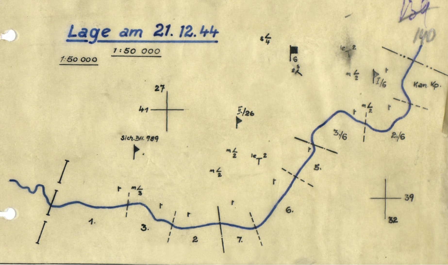 Ic-Morgenmeldung vom 22.12.1944: .... 30.I.D.: Ruhiger Verlauf der Nacht. Mässiges Inf.-Störungsfeuer vor linkem und rechtem Div.-Abschnitt. Lebhaftes Inf.-und Pak-Feuer in der Mitte. Rege Feindliche Fliegertätigkeit auch in den Nachtstunden. Vier Fliegerabschüsse wurden beobachtet. 2 deutsche Kriegsgefangene bei Sich.Btl. 989 zurückgekehrt. 1.)a) Ruhiger Verlauf der Nacht. Bei Einbruch der Dunkelheit erneut Mot.-Geräusche im Einbruchsraum festgestellt. 1.)b) Bis 21.00 Uhr rege feindliche Fliegertätigkeit mit Bombenwürfen in rückwärtigen Bereich der Gruppe. Gruppe Thomaschki Ic-Meldung, 22.12.1944. .... 30.I.D.: A 1: Allgemein ruhiger Verlauf der Nacht. Am Tage etwas lebhafteres Feuer schwerer Inf.Waffen auf Süd- und Ost-Front der Div. - Feindeindruck unverändert. A 2: Um 21.00 Uhr Spähtrupp von 6 Mann in FK 7c abgewiesen. Schanzarbeiten bei 49,9. Am Nachmittag des 21.12. mot-Geräusche aus FK 5. Am Vormittag verstärkte mot-Geräusche im Raum Skuodas ohne erkennbare vorherrschende Richtung. A 3: Lebhaft rege fdl. Fliegertätigkeit bei Tag und Nacht. Ostwärts 49,9 landen und starten mehrere einmotorige Flugzeuge. E: 2 Feindtote durch Scharfschützen 1 Gef. (Flieger).Verweigert Aussage. Beschuß: l05 Art., 110 Pak, 150 GrW. KTB Gren.Rgt.6. Während der Nacht lebhaftes feindl.Inf.- und Pak-Feuer, ferner laufend Überflüge feondl.Flugzeuge in nordwestl.Richtung. Am frühen Morgen flaute das Feindfeuer ab, der Tag verlief ruhig. Bei 12,2 (Scharfschützenhöhe) um 16.30 Uhr 2 Minendetonationen. Ab 17.00 Uhr Überflüge zahlreicher fdl.Flugzeuge. Nördl.Maurini stürzten um 18.10 und 18.25 Uhr je 1 feindl.Flugzeug brennend ab. In Gegend Gef.Std. 14./6 (GLudausi) wurde 1 Russ aufgegriffen, der angab, beim linken Nachbarn ungehindert durch die HKL gekommen zu sein und überlaufen zu wollen. Er wurde zur Div., Abt.Ic weitergeleitet. 20.30 Uhr Eisenbahngeräusche aus Südwesten und Skuodas. |