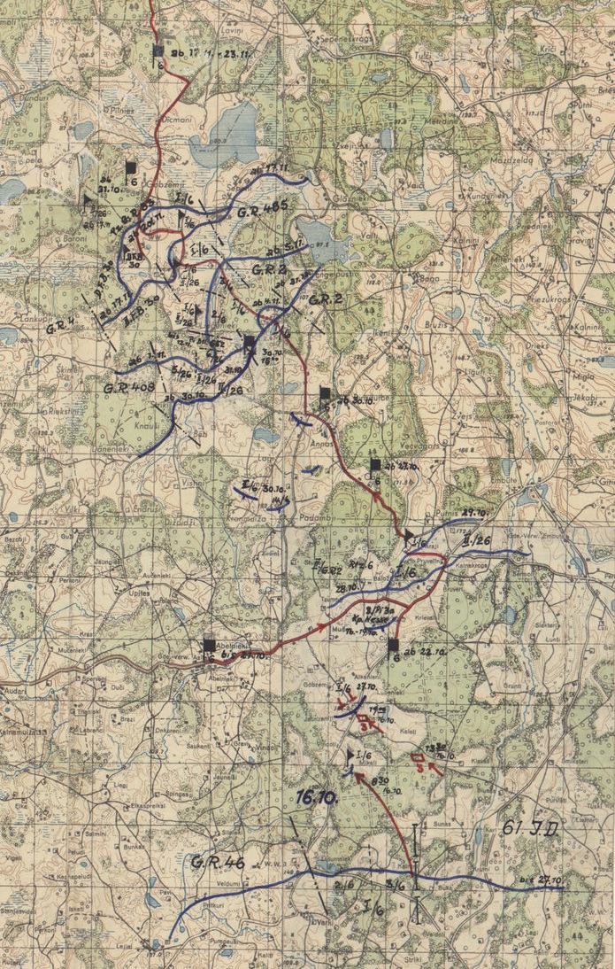 KTB Gren.Rgt.6. Der Fahrzeugverkehr beim Feind war am heutigen Tage wesentlich stärker. Vermutlich handelte es sich um Versorgungsverkehr vom Bahnhof Skuodas aus. Ebenfalls wurden zahlreichere Bewegangen bei Upesgrieteni und Strungi gemeldet. Im Waldabschnitt südwestl. Tolki wurde gegen Mittag ein fdl. Spähtrupp abgewiesen. Im übrigen verlief der Tag ruhig. Der lebhafte Verkehr flaute erst mit beginnender Dämnerung ab. Das fdl. Störungsfeuer war gegenüber dem Vortage wesentlich geringer. Begünstigt durch das umsichtige Wetter konnte der Ausbau der 2.Stellung durch den Bauzug fortgesetzt werden. Der Reiterzug baute die 2. Stellung im des I./6 weiter aus. |