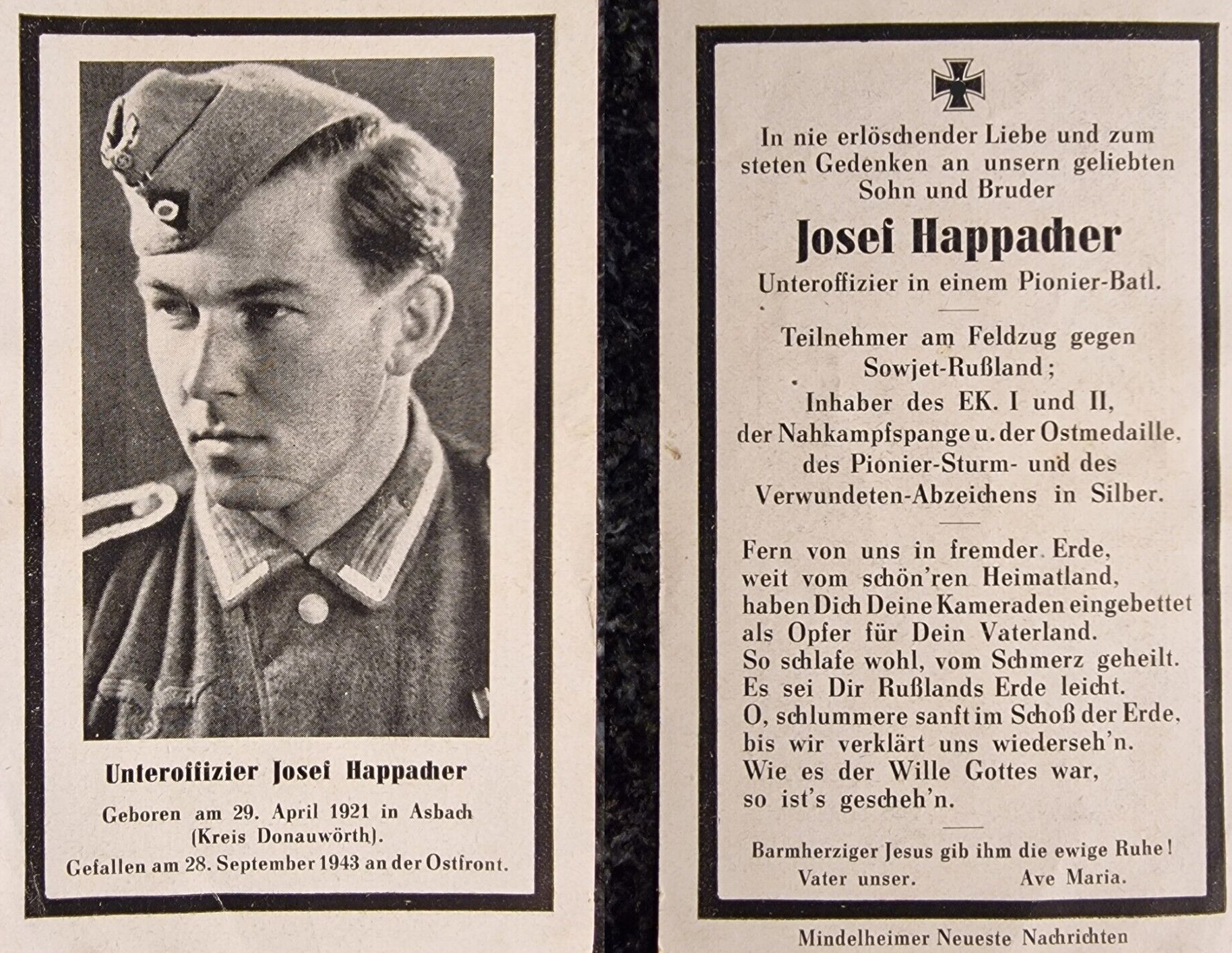 | Happacher Josef | 27.9.43 gefallen Otudeney bei Kanew (Uffz.) GRablage Otudeny, Nordausgang Feldgrab; | geb.29.4.21 | ||