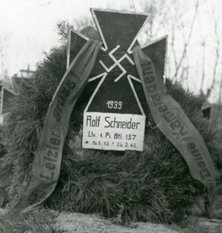 | Schneider Rolf-Harry | am 24.2.42 Teterewino schwer verwundet I.G.Bauch, 26.2.42 Belgorod verstorben (Lt.); | geb.: 16.5.13 | ||