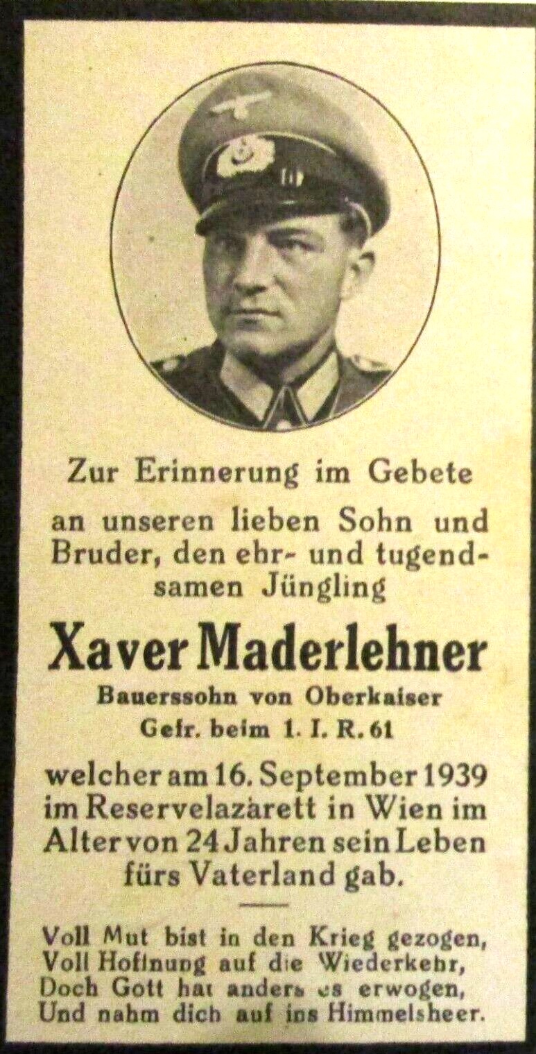 | Maderlehner Xaver | am 16.9.39 im Res.Laz.Xb Wien verstorben (Ischialgie) (Gefr.); | |||