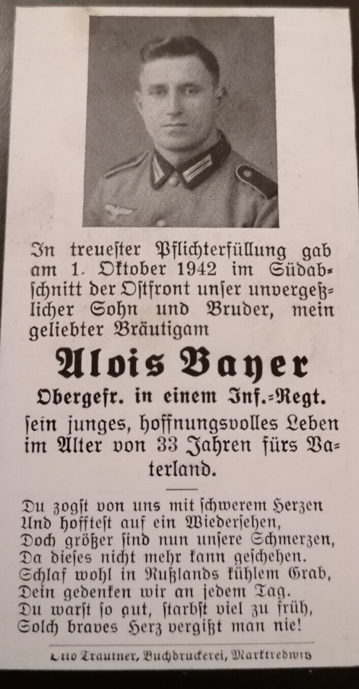 | Prucker Alois | 7.9.41 gefallen Mogila Wissokoja, Gr.Spl.(Uffz.) | geb.31.5.14 | |