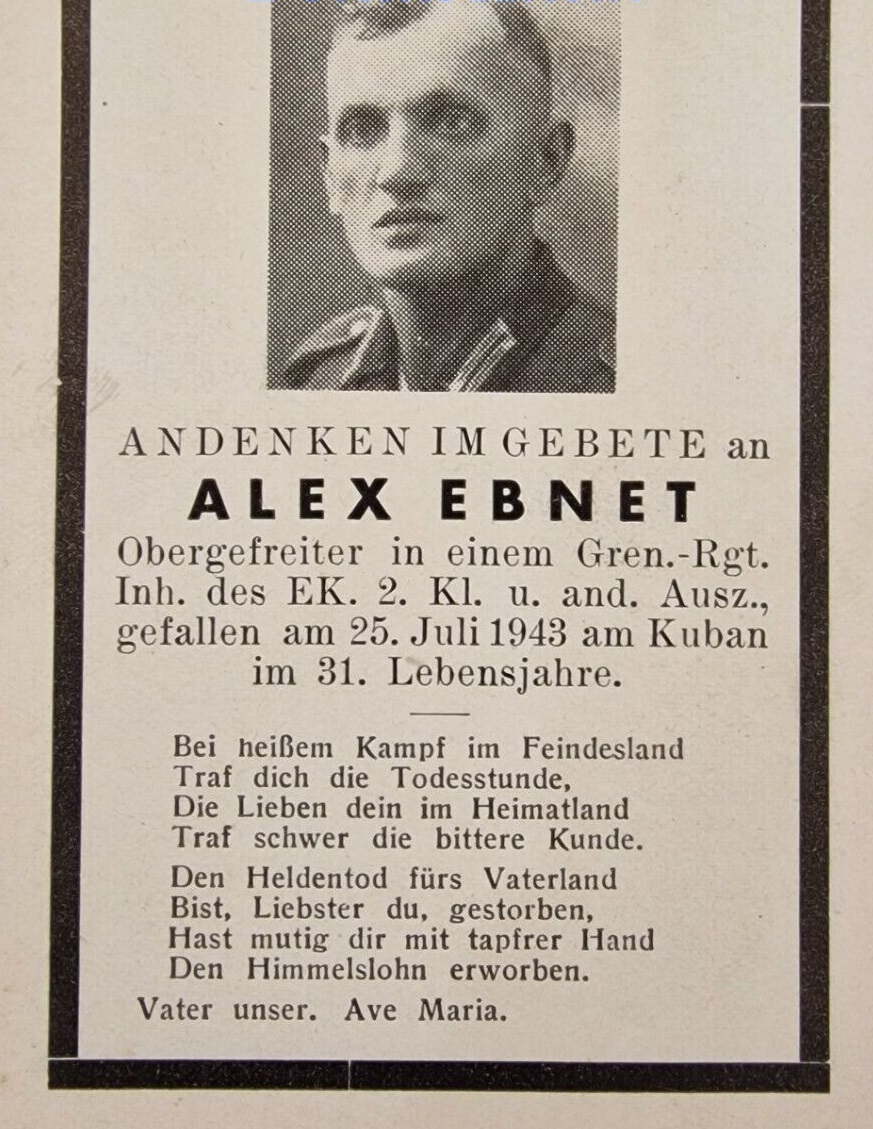| Ebnet Alex | 25.7.43 gefallen Höhe 352,0 nordostw.Noworossijsk A.G.R. (Ogfr.), Grablage 2km nordostw.Kolch.Lipki b.Oruelle; | geb.9.3.12 | |