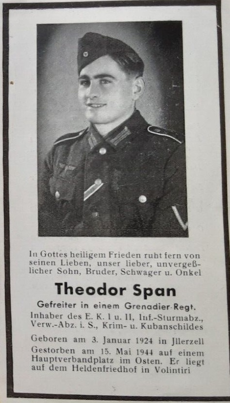 | Span Theodor | 15.5.1944 7.40 Uhr gefallen Kolintisi, Grablage Heldenfrdhf.Kolintisi (Gfr.); | geb.3.1.1924 | ||
