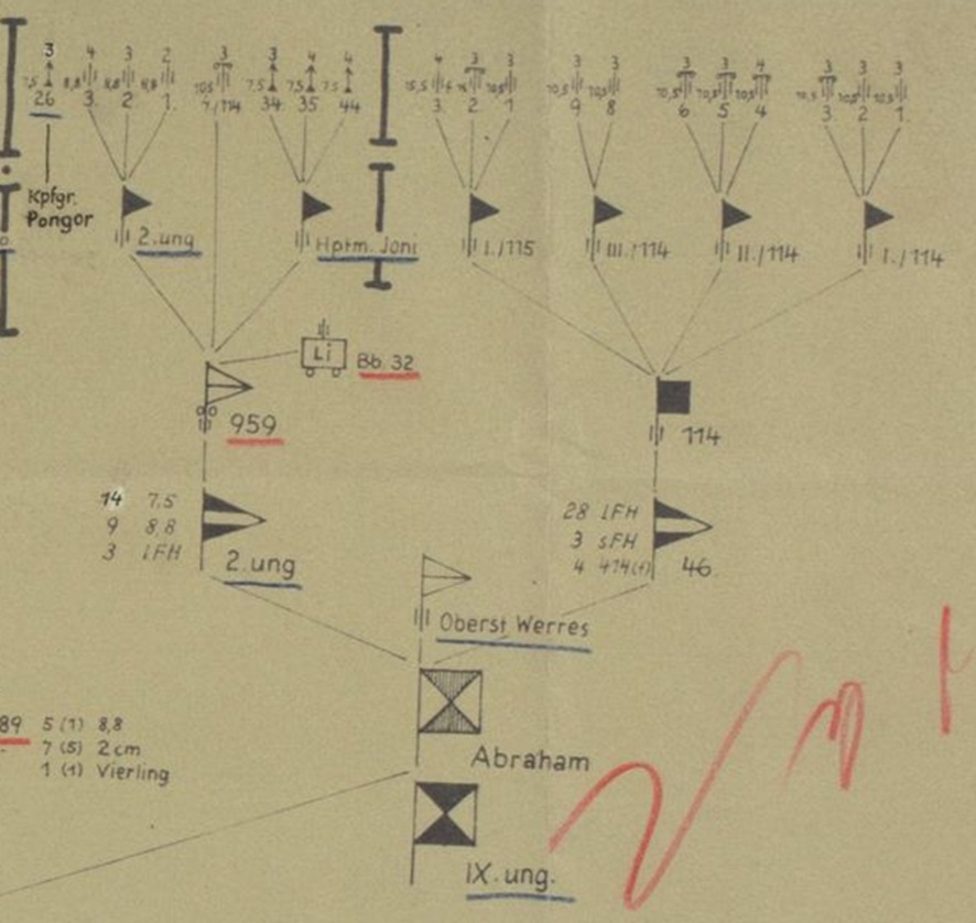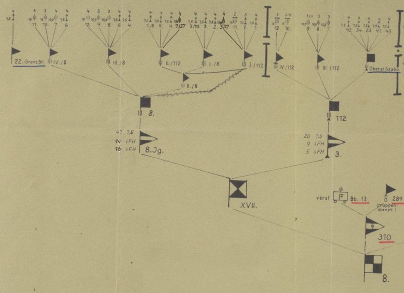 8.Armee Stand 26.9.1944 unter H.Gr.Süd. Anlage zu Ob.Kdo.H.Gr.Süd Ia/Art Nr.3715/44 g.Kdo. v.26.9.44 Harko 310 Stg.Brig.325 (in Auffrischung), 325 (in Auffrischung) H.Flak-Art.Abt.(bdstg.)289 verst.Wetterzug Beob.Abt.(mot) 13 Gruppe Schopper. Arko ? Art.Brig.Stab 959 Beob.Abt.(mot) 32 (in Zuführung aus Auffrischung) XVII.Armeekorps. Arko 7 |