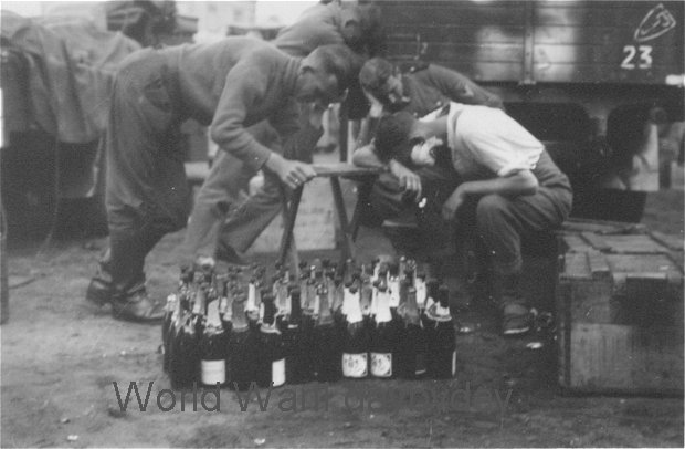 Diese Soldaten haben den Sieg über Frankreich anscheinend mit zuviel champagner begossen. Deutlich zu erkennen das Dietrich Symbol an der Bordwand des Lkw.