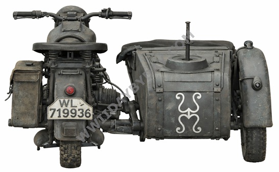 ![]() Ein Beiwagenkrad mit einem Symbol unbekannter Bedeutung. Eventuell ein ein verschnörkeltes "W" |